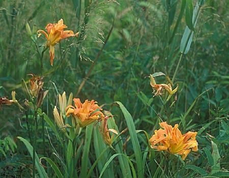 道ばたや林のふちなどに多い多年草.有史前に中国から帰化したと考えられている.花は八重咲きで,雄しべと雌しべが花弁状に見える.同時期に咲くノカンゾウの花は一重で葉が細いことで見分けられる.若芽は山菜として食用にされる.
